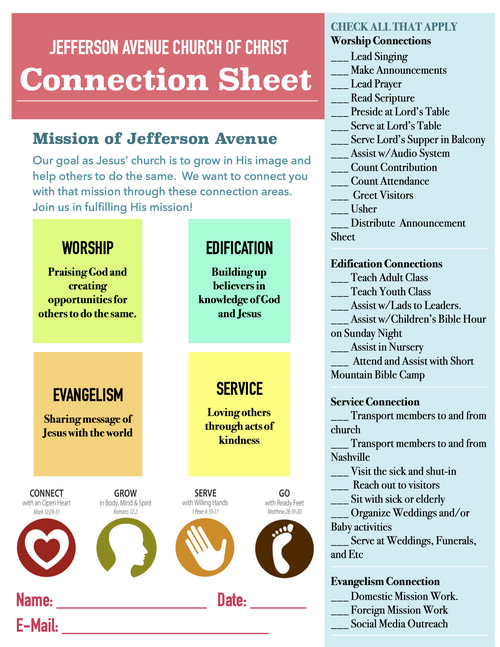 There are many opportunities for you to serve and be served by the ministries of Jefferson Avenue. The list below is just a small sample of all that is happing at JA. To volunteer, contact the ministry leaders listed below or complete this sign-up sheet and return it to the church office.